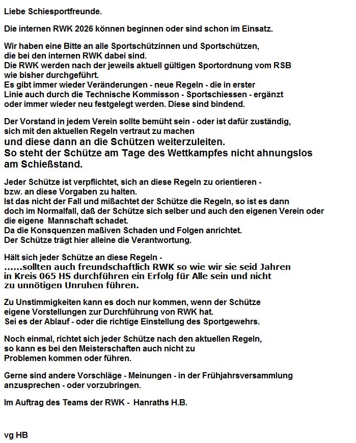 Aktuelles ≡ Rundenwettkämpfe 2026 - Starterlisten ≡ Ausschreibung Rundenwettkämpfe 2026 - neu Informationen zur Änderung gibt es -> hier ≡ RWK 2026 - bitte lesen Wettkämpfe ≡ Termine Bezirksmeisterschaft 2026 ≡ Ausschreibung Bezirksmeisterschaft 2026 ≡ Ergebnisse Kreismeisterschaft 2026 ≡ Kreispokal 065 ≡ Kreisliga 065